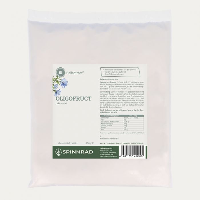 Oligofructose, auch bekannt als Oligofruct, ist ein prebiotischer Ballaststoff, der in vielen heimischen Pflanzen wie Weizen oder Spargel vorkommt. Das Spinnrad Oligofruct wird aus der Zichorienwurzel gewonnen und ist kalt löslich, wodurch es sich hervorragend in Joghurt, Quark, Smoothies oder Getränken auflöst. Mit etwa 30 % der Süßkraft von Zucker sorgt das Oligofruct Pulver für eine angenehme, natürliche Süße. Besonders in fermentierten Milchprodukten wie Joghurt mit Früchten verstärkt Oligofructose das natürliche Fruchtaroma und sorgt für ein vollmundiges Geschmackserlebnis. Das Pulver eignet sich ideal für alle, die ihre Ernährung ballaststoffreich gestalten und gleichzeitig den Zuckeranteil reduzieren möchten.